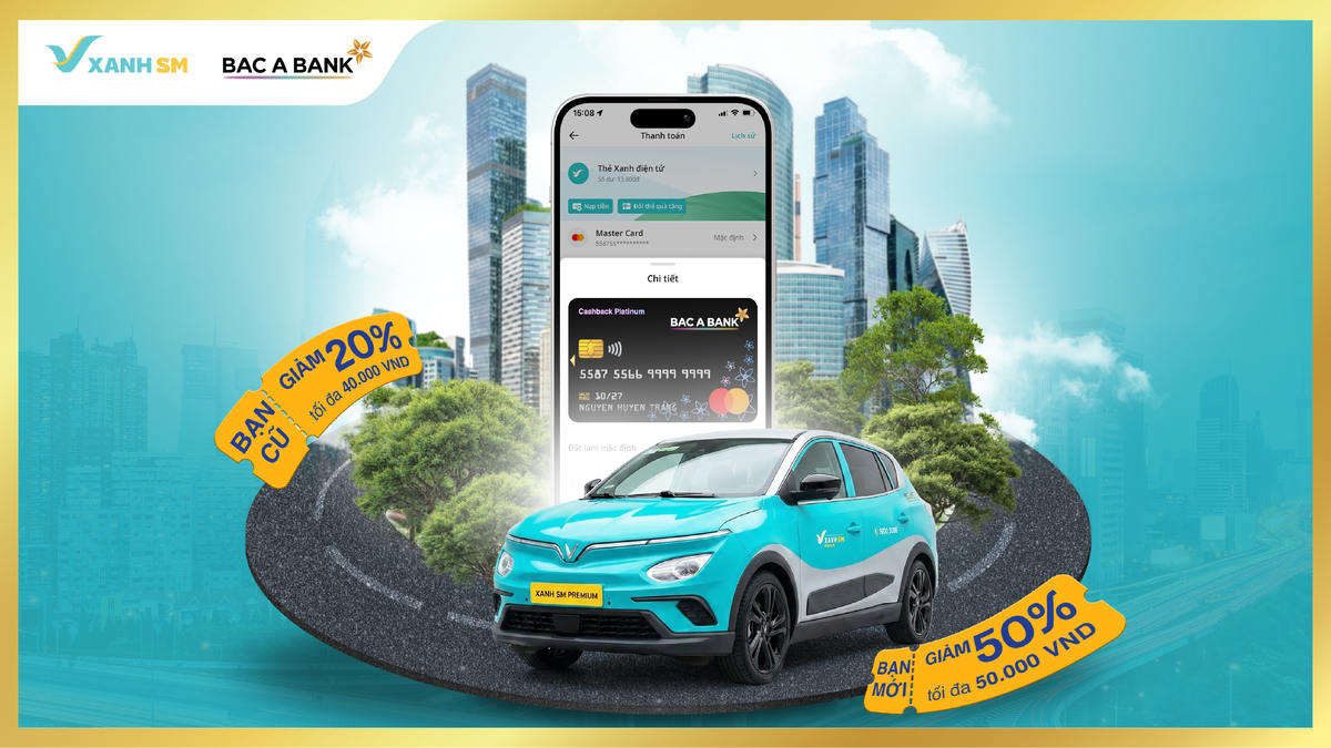Năm mới, cùng BAC A BANK lựa chọn những điều tốt hơn. Chọn Xanh SM - nhẹ nhàng cho bạn, tốt hơn cho môi trường. Hơn thế nữa, khi đặt dịch vụ trên ứng dụng Xanh SM & thanh toán bằng thẻ tín dụng quốc tế BAC A BANK MasterCard.